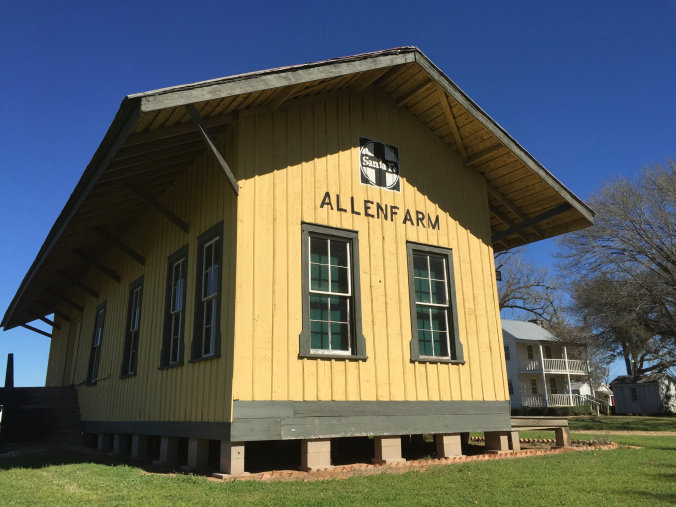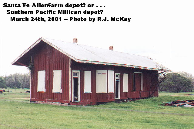 The above depot sat along the east side of the highway a short distance due north of the community of Allenfarm. Although the second photo identifies it as a Santa Fe depot, its heritage has not been verified and its disposition and current location is unknown.
