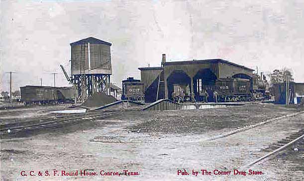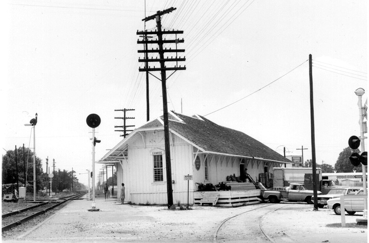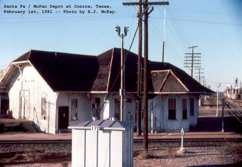 Conroe was a crossroads of the International & Great Northern (I-GN) Railroad and the Gulf, Colorado & Santa Fe (GC&SF) Railway. The I-GN became part of Missouri Pacific, and the GC&SF was bought by the Atchison, Topeka and Santa Fe Railway. A union depot sat at the crossing.