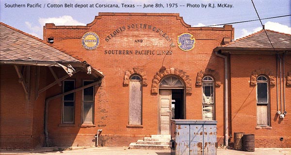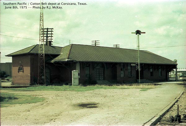Corsicana was served by two railroads that became part of Southern Pacific (SP): the Houston & Texas Central (merged into the Texas & New Orleans in 1934) and the St. Louis Southwestern ("Cotton Belt".) It was also served by the Trinity & Brazos Valley which, after bankruptcy, was reorganized as the Burlington - Rock Island Railroad.