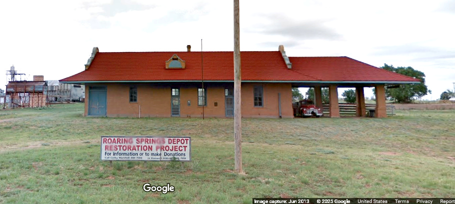 Roaring Springs was served by the Quanah, Acme & Pacific Railway. See Tower 27.