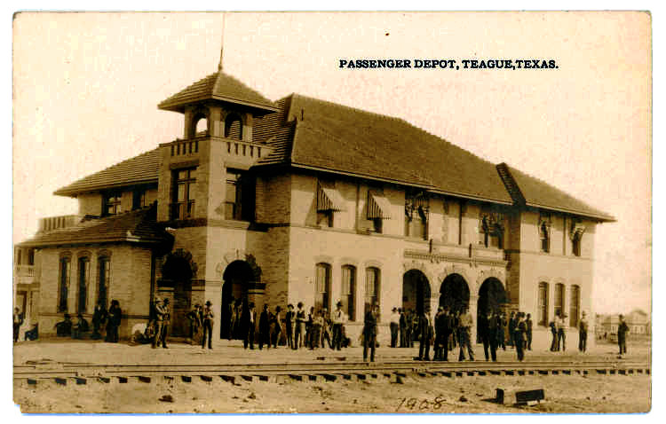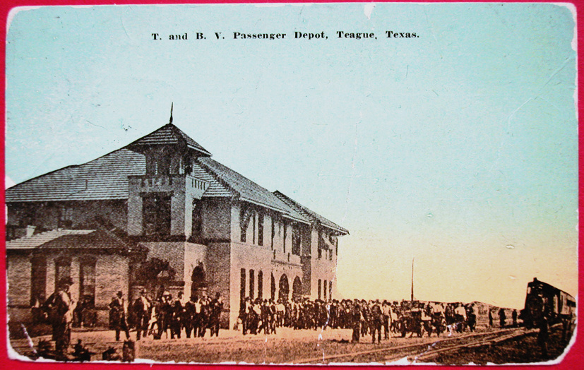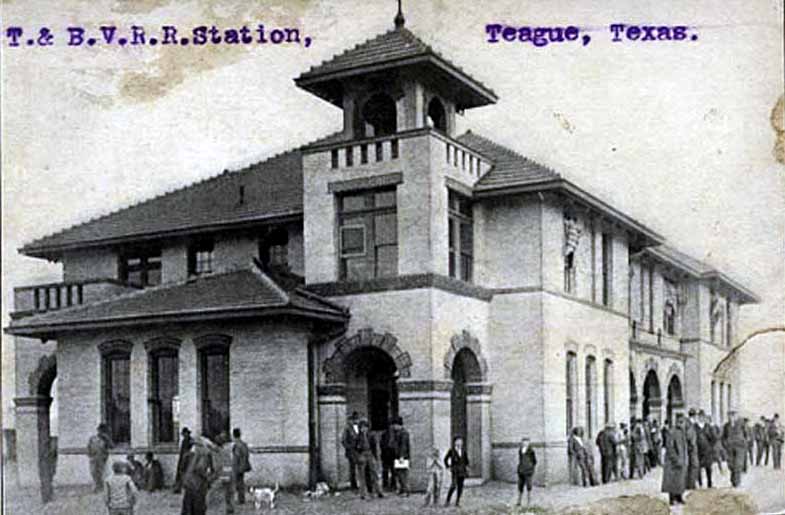 Teague was served by the Trinity & Brazos Valley (T&BV) Railway. Coming out of bankruptcy, the T&BV was reorganized as the Burlington - Rock Island Railroad.
