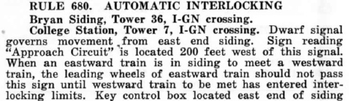 A 1952 T&NO Employee Timetable shows Tower 7 and 36 both having "continuous" office hours, i.e. they were manned 24 / 7. This may seem obvious for a manned tower, but in some places (e.g. Tower 33), towers had begun to close for specified periods on a regular schedule (e.g. lunch hour, overnight, Sundays were common.) Railroads began to reduce staffing further to save money, and some towers opened only for a basic "day shift", leaving the signals lined for the busier track at all other times. A telephone was accessible nearby if a train on the other line needed to call an operator at home to come in and change the signals. This approach worked to reduce staffing costs, but it was only effective at select locations where one of the tracks had limited traffic. Neither Bryan nor College Station qualified.