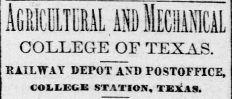 college had no street address; it was simply "Railway Depot and Postoffice, College Station, Texas." Left: Galveston Daily News, August 10, 1880 |