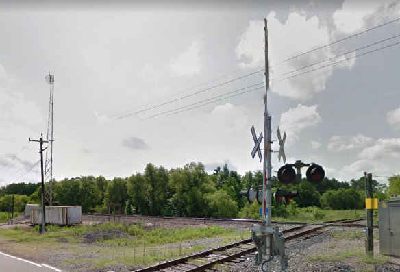Left: This Google Earth image shows the Tower 125 crossing at Mauriceville. North of there, MP abandoned the tracks to Buna and beyond in 1963. The SR&N bought the abandoned ROW and laid new tracks to Buna in 1967, the year after construction of its line from Echo had begun. The Tower 125 interlocker was located in the depot on the north side of the crossing. A 1956 KCS employee timetable listed the Mauriceville crossing as "Interlocked" but did not include "(Automatic)" as it did for some of the other crossings listed. It's likely that the crossing was converted to an automatic interlocker by the mid-1960s. A connecting track in the southern quadrant probably existed in the Yoakum era, and it appears on imagery from 1930 until it was removed between 1996 and 2004. Similarly, a connecting track in the eastern quadrant that probably dated to the Yoakum era is visible on imagery from 1930 to 2018, but is not present on 2020 imagery. |