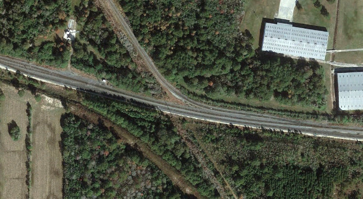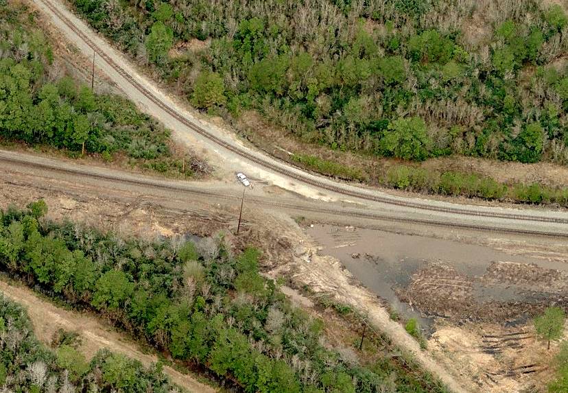 | Right: This bird's eye view of the Tower 11 crossing from c.2005 shows substantially disturbed earth, perhaps in preparation for the additional track that UP added through this junction. Compare this view with the satellite view from 2019 farther above. The tower was located approximately where the utility pole sits southwest of the crossing. The location remains to be field-checked for evidence of the tower's foundation, but the chances are slim since it was removed nearly a century ago. |