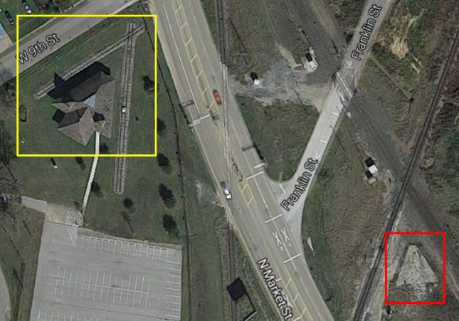 Below: The Hearne depot was relocated (yellow) across the highway from