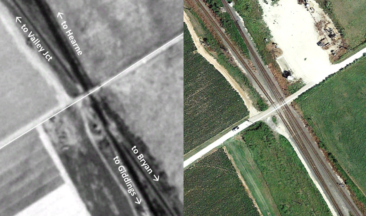 of the Tatsie crossing show the changes resulting from the 1996 UP/SP merger. Prior to the merger, the UP line (between Bryan and Valley Junction) and SP's Dalsa Cutoff (between Giddings and Hearne) crossed at an acute angle (left,
