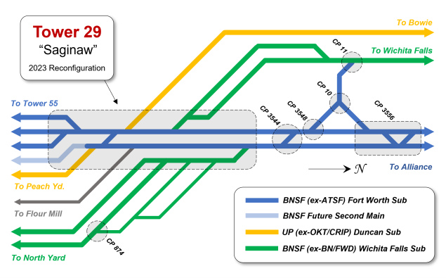 This track chart (with North to the right) illustrates the traditional track topology at Tower 29