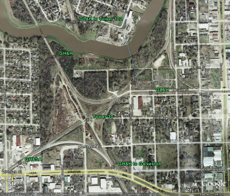 Magnolia Park (Tower 102) in Houston. At Harrisburg, the GL&H tracks crossed the GH&H and GH&SA