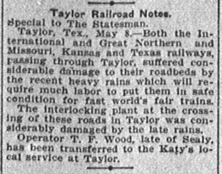 interlocker. Left: The Austin Statesman of January 22, 1904 carried this news item regarding the construction of the interlocking tower at Taylor. Right: Only a few months later on May 9, the Austin Statesman reported that heavy rains had damaged the tower. |