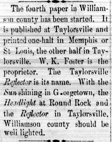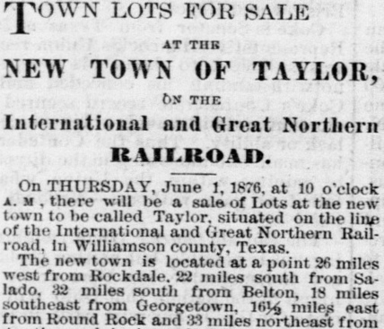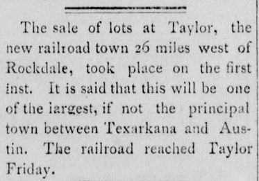 24, 1876 noted that the "railroad reached Taylor Friday", which was the