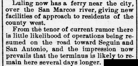 been filed with the Handbook of Texas. Right: The Galveston Daily News of March 3, 1875 conveys the consensus that Peirce was in no hurry to resume westward construction. What the story does not say is that he may have been negotiating with Comal County. |