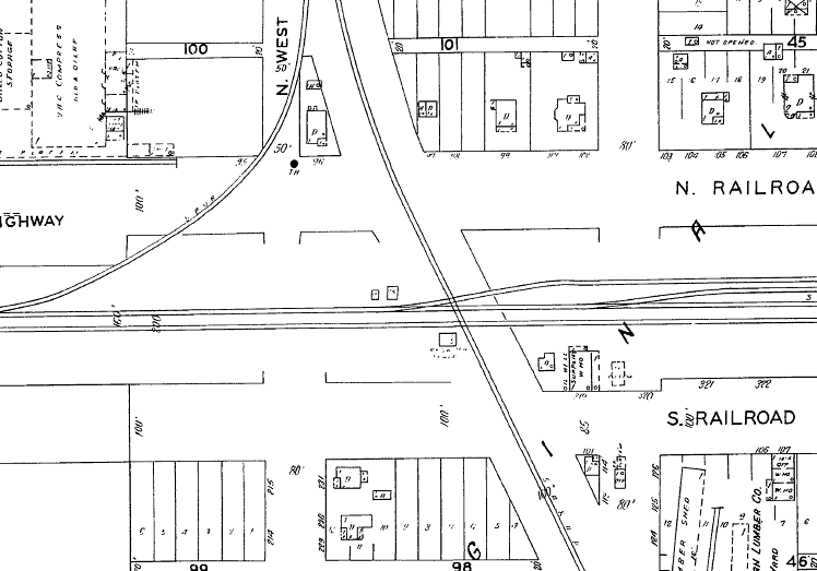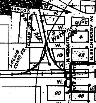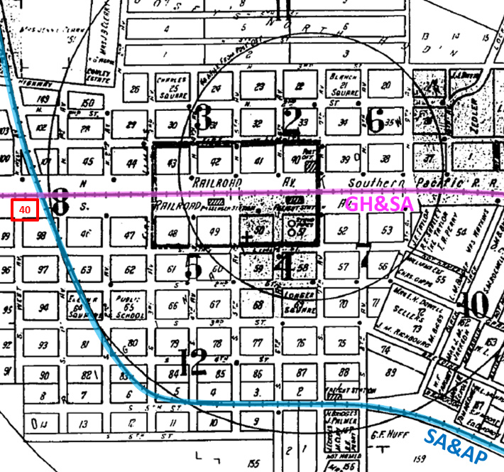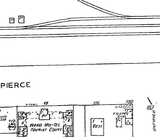 intact. It was abandoned by SP in 1942. Right: The Tower 40 structure was relocated a few dozen yards south of the crossing and became part of a gas station. The 1941 Sanborn map shows a "Filling Sta" located on the corner of Mesquite St. and Pierce St., where Tower 40 continues to reside. The "2" indicates that the station structure had two stories and the almost illegible "1" in the box above it is the overhang built to shelter the pumps. "S. Railroad" became "Pierce" sometime between 1929 and 1941. This is presumably another manifestation of the confusion regarding Thomas W. Peirce's last name, spelled "ei", not "ie". |