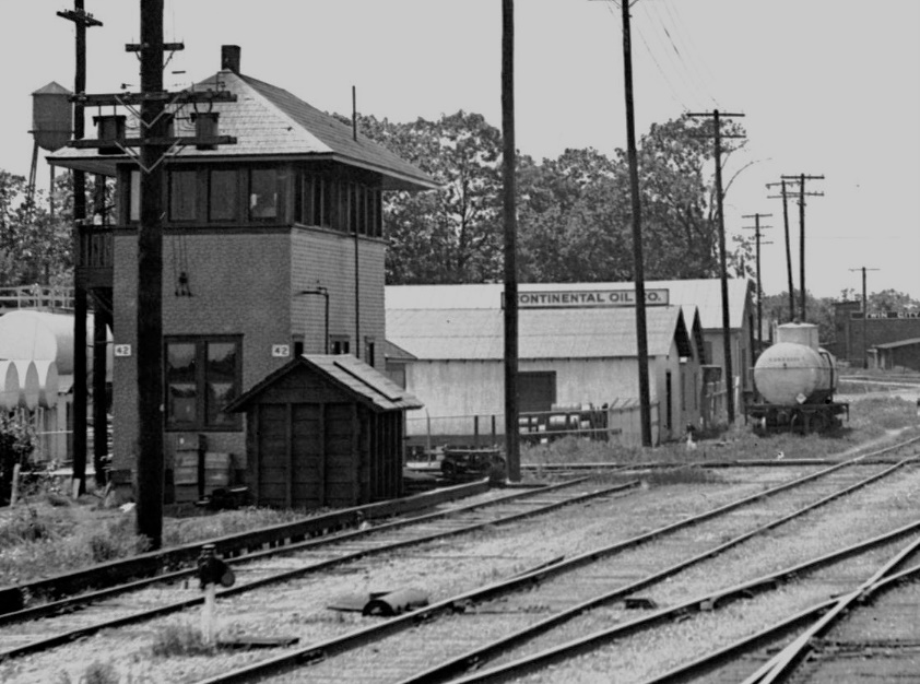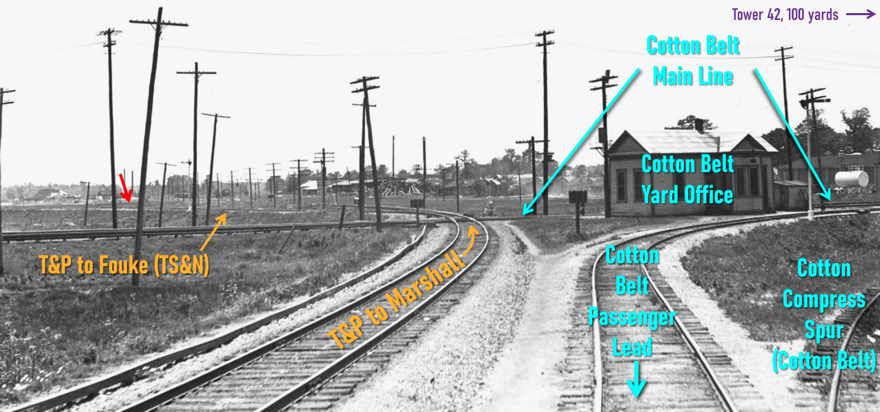Cotton Belt tracks. The adjacent white cabin, partly shaded, sits where Tower 42