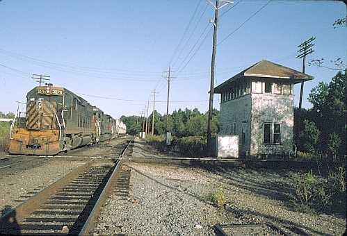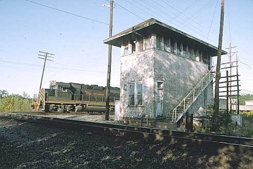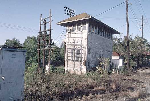 facing due west but by timetable, it is traveling south. Right: A Denver and Rio Grande Western Railroad locomotive unit leads a Tyler-bound intermodal train past the tower on SP's former Cotton Belt tracks. both photo taken by Myrone Malone on October 11, 1992 |  |