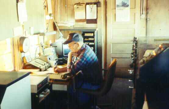 | Right: This interior photograph of Tower 42 was taken in 1988 by Paul Farfrak. Nothing much would have changed by the time the tower was taken out of service in the early 1990's. The levers and interlocking machine along the right edge of the photo were removed from the tower by a local Texarkana historical group just before the tower's demolition. |  |