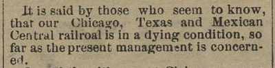 September, 1880 under a new name, the Chicago, Texas & Mexican Central (CT&MC).