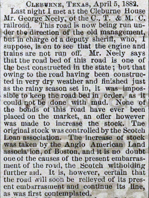 Texas Trunk and the Dallas, Cleburne & Rio Grande roads." The story also