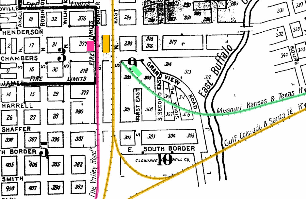 depots were located relative to the tracks entering Cleburne. The T&BV and Santa