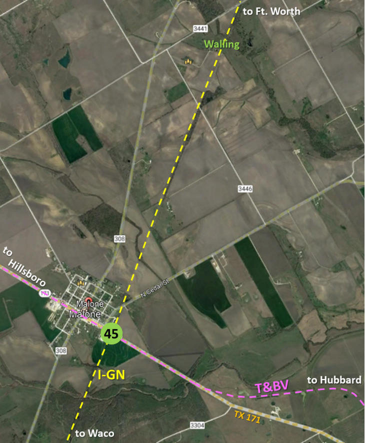 The T&BV line through Malone was part of a route originally constructed between Cleburne and Mexia. It never reached its original target, Beaumont, because it was taken over by B. F. Yoakum in 1905 and redirected to become a lengthy north/south route through Teague connecting Yoakum's railroads in Houston with those in north Texas via Waxahachie and trackage rights into Dallas. Eventually, as Yoakum's rail enterprise failed financially and splintered into its separate components, the T&BV remained operational during its lengthy receivership that began in 1914. When it ended in 1930, a new railroad, the Burlington - Rock Island Railroad, was established to take over the T&BV's assets. By this time, the growth of the rail network in Texas had rendered the line between Cleburne and Mexia unnecessary. The T&BV rails through Malone were abandoned in 1935 and Tower 45 was decommissioned at that time. For the entire route between Cleburne and Mexia, Texas Highway 171 was built and sits parallel to or directly atop the T&BV grade in many places. The I-GN line through Malone had a much longer life as part of the Missouri Pacific's line from Waco to Ft. Worth and was not abandoned until 1967. Remnants of the I-GN, particularly concrete bridges, are easily spotted from Farm Road 308 north and south of Malone.
