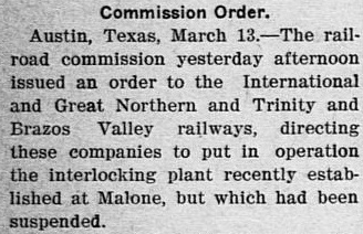 structure. A photo of this tower has not been located. Left: This snippet of an article from the Palestine Daily Herald dated March 14, 1908 states that RCT had ordered the two railroads to put the Malone interlocking back into service after some period of being "suspended". It also describes the interlocker as being "recently established" although the RCT files list a commissioning date nearly four years earlier. The reasons for the suspension are unknown. |