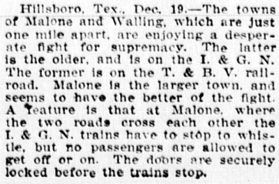 As soon as the railroad was built a fight started between the towns of Malone and Gehring, the town earlier called Walling. The railroad fight was so great that when the I&GN train would pass through Malone it was compelled to stop because of a gate that had been erected across the tracks. The conductor would lock all doors and the passengers who wanted to get off at Malone would have to go to Gehring and find a way back to Malone. The I&GN, which owned the townsite of Walling/Gehring, was interested only in its success. It refused to make a stop at Malone. A. D. Walling made several trips to Austin before the Railroad Commission. Finally he persuaded them to force the I&GN Railroad to build a station in Malone. After the station was built, Gehring faded away.