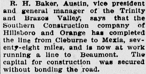completed between Cleburne and Mexia. RCT records show this construction was completed in 1904.