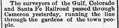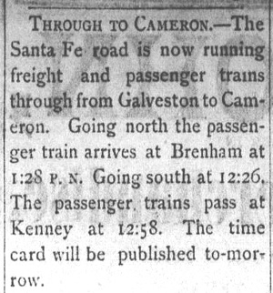 as the westward expansion beyond Belton slowed. Right: Service to Cameron from Galveston began in November, 1880. (Brenham Daily Banner, November 9, 1880.) |