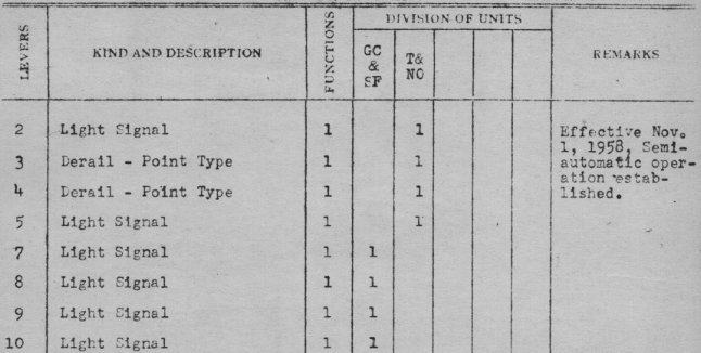 direct rates (for labor) and overhead rates (for materials.) The document shows that a new plan dated January 25, 1923 was implemented but the effective date is not specified. A revision was made on August 14, 1926 to account for Santa Fe adding functions to previously "Spare" levers 11, 22 and 23. Another revision occurred on August 8, 1933 when lever 28 was deactivated and returned to "Spare" status. It had previously controlled a "Switch Lock and Hayes Der." (derail) for Santa Fe. The interlocker was restructured effective June 14, 1941. The changes were sufficiently complex that the decision was made to create a new, 2-page document (on July 29, 1941) rather than attempt to mark up the original any further. After the 1941 changes, there were no modifications until May 1, 1951 when Santa Fe installed "light type signals" (presumably replacing semaphore signals.) Planning for this change, yet another version of this document was generated on April 11, 1951. The last documented change to the Tower 52 interlocker became effective on November 1, 1958 (below, Carl Codney collection) when "Semi-automatic operation" was established and the cost sharing became 50/50. ![]() |