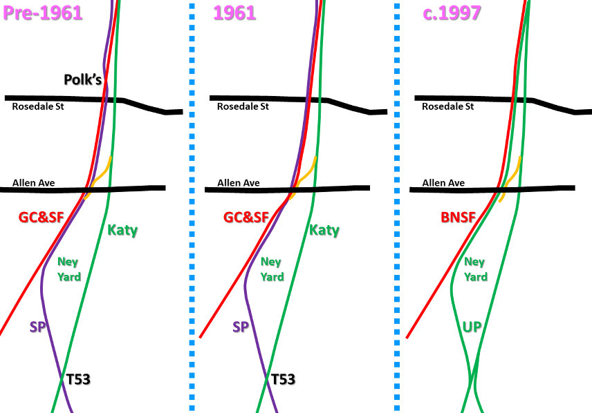 track west of the Katy -- the north end couldn't terminate at Broadway Yard (abandoned), and the south end no longer crossed at Tower 53 (removed).