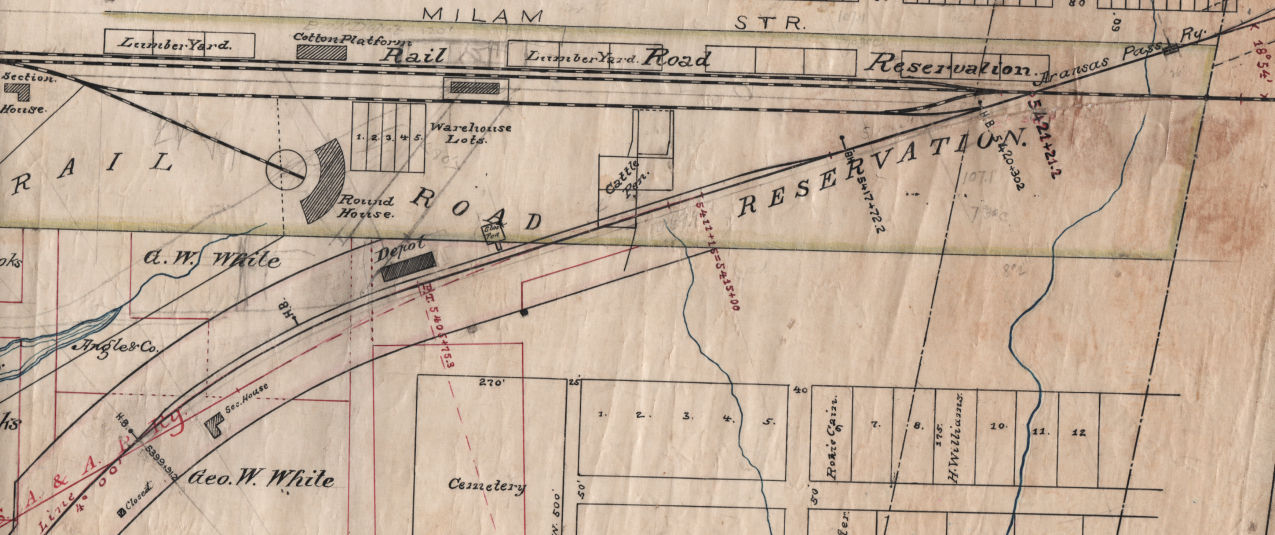 shows the SA&AP right-of-way curved to form an acute angle as it crossed the