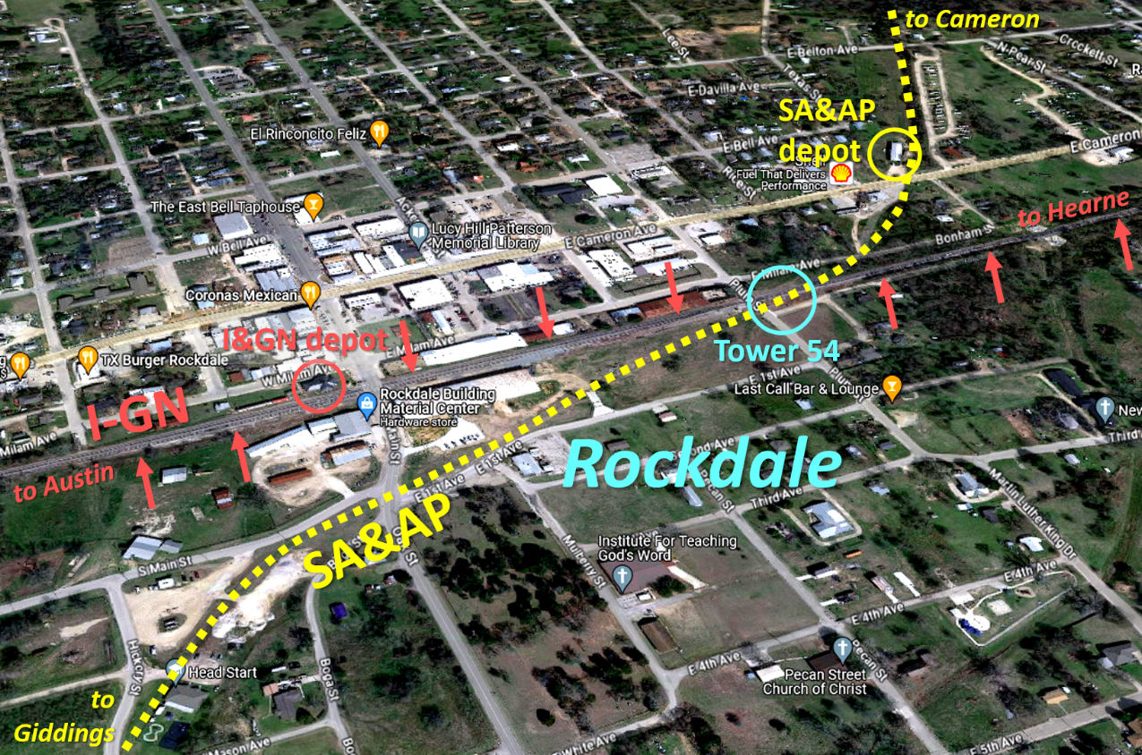 Kansas & Texas Railroad illustrates the crossing at Rockdale. Tower 54 is not