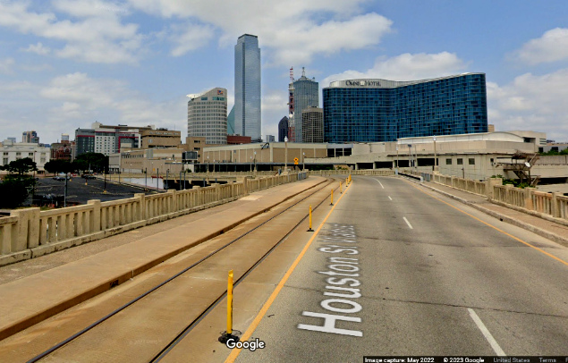 plate girder. On the Dallas end of the viaduct, Houston Street begins parallel
