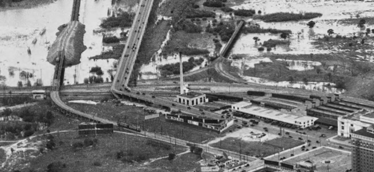 of the railroad bridge and northwest of the corner of Elm and Houston,