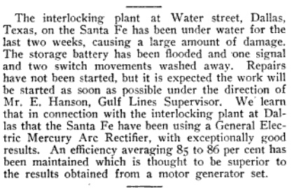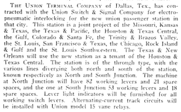 Left: The Railway Age Gazette of September 10, 1915 carried this brief news item announcing that a Union Terminal Company contract had been awarded to Union Switch & Signal Co. for two interlocking machines to control traffic in the vicinity of the "new union passenger station..." Union Station would open thirteen months later. It notes that the Texas & New Orleans (T&NO) Railroad would use Union Station as a "tenant of the Houston & Texas Central". Both T&NO and H&TC were owned by Southern Pacific (SP). The H&TC line was the first railroad in Dallas, passing through in 1872 building north to Denison to complete its main line from Houston. The T&NO line ran from Dallas southeast to Beaumont via Kaufman, Jacksonville and Lufkin. In 1927, SP would make T&NO its principal operating company for Texas and Louisiana, leasing the H&TC and other SP railroads in Texas to the T&NO. In 1934, this was converted to a merger; the H&TC ceased to exist as it was consolidated into the T&NO. |