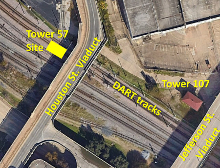 and Broadway and Water streets no longer exist. The following railroads have been highlighted on the map as their labels are illegible at this resolution: The Cotton Belt entered downtown from the north to reach the DTR&UD passenger station built in 1903. This was a branch that came off their line at Addison between Commerce and Ft. Worth. Santa Fe tracks from the south ran adjacent to the tower and terminated in downtown. This was a short branch off their line between Cleburne and Paris. Tracks of the Missouri, Kansas & Texas (MK&T, "Katy") passed near the tower and continued south to Hillsboro and north to Denton. At Denton, they intersected a shared line of the Katy and the Texas & Pacific (T&P) that ran between Whitesboro and Ft. Worth. The T&P also had east/west tracks through downtown Dallas several blocks north of Tower 57. The Rock Island tracks are visible on the berm in the photos above. They continued north along Water St. and then turned west to cross the Trinity and proceed to Ft. Worth. They also went southeast to a junction with Southern Pacific (SP) south of downtown. |