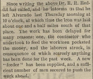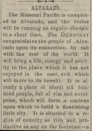 there on the Houston & Texas Central (H&TC) Railroad. Left: Fort Worth Daily Democrat, June 7, 1881, reprinting a news item from the Alvarado Bulletin reporting MP's plan to also build northward from Waco. Ennis was a major base for the H&TC. Right: Fort Worth Daily Democrat, August 2, 1881, reporting that the track-laying north from Waco had reached to within one and half miles of Alvarado. |