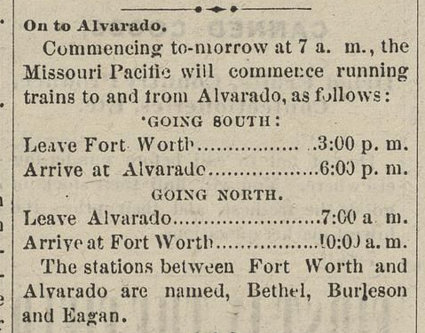 the end of 1881. The track distance from Alvarado to Cleburne was approximately