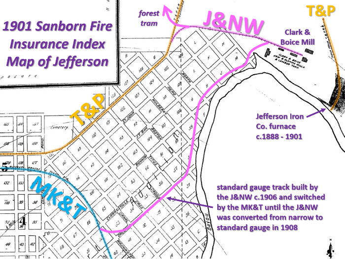 Fire Insurance index map shows the T&P entering Jefferson on the