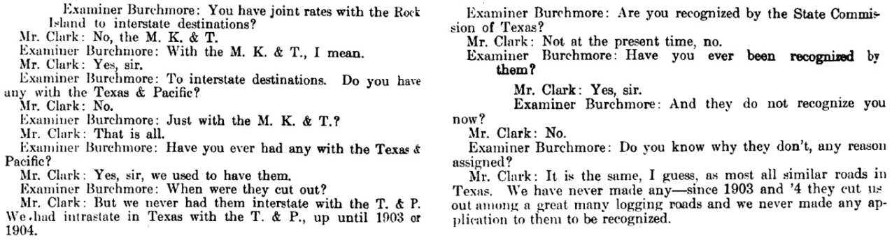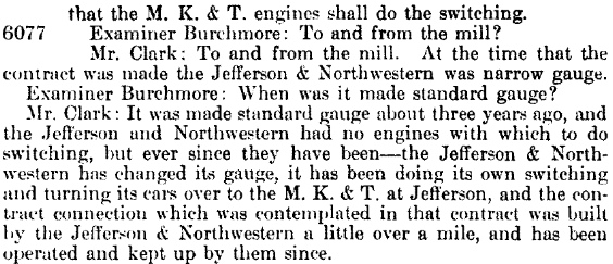 T&P spur (at far right) served the Jefferson Iron Co. Below: On January 27, 1911, F. I. Clark, Vice President of the J&NW, was called before the ICC at a hearing in St. Louis to give testimony about the operations of the J&NW (read Clark's entire testimony here.) The ICC was gathering evidence in the Tap Line investigation and the J&NW's examination was one of several conducted on that day. Clark was answering questions from ICC Examiner Burchmore and had begun to explain that the J&NW's 1906 contract with the MK&T stated... ![]() "Transcript of Stenographer's Notes of Hearings Held at St. Louis, Missouri, January, 1911, in Proceeding Before Interstate Commerce Commission" (Harvard Law Library, a Gift of Oliver Wendell Holmes made on January 20, 1923) |