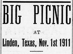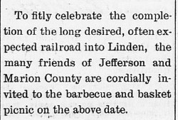 Linden) Right: The J&NW branch to Linden was completed in late October, 1911, and a "first train" picnic celebration was held at Linden on November 1, 1911. (Jefferson Jimplecute, October 27, 1911) |