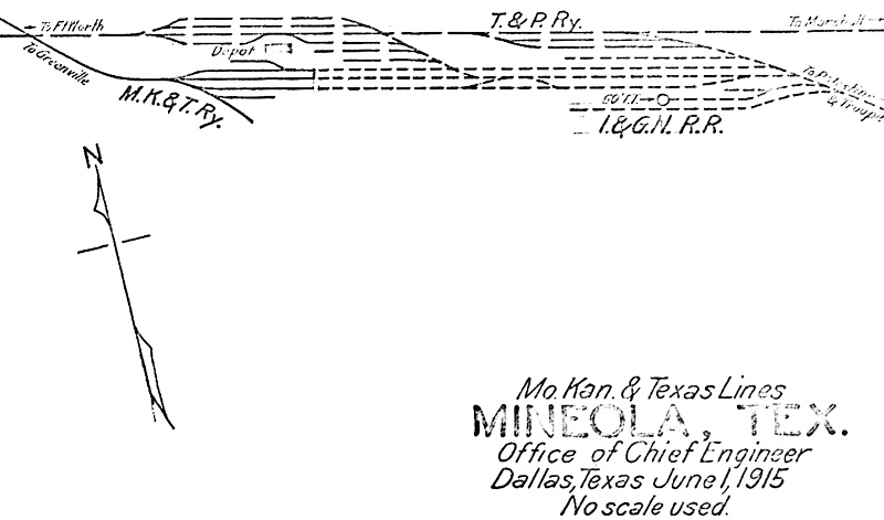 track chart of Mineola (hat tip, Ed Chambers) shows that the "M.K.& T.Ry." and