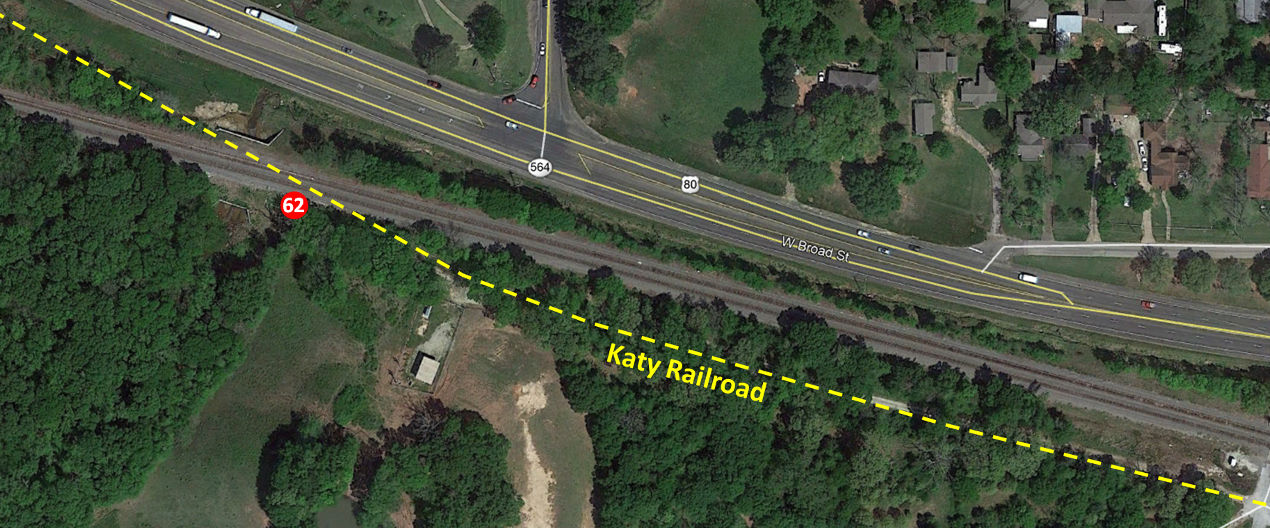 which a lightly used rail line (e.g. the Katy branch from Greenville) crossed a