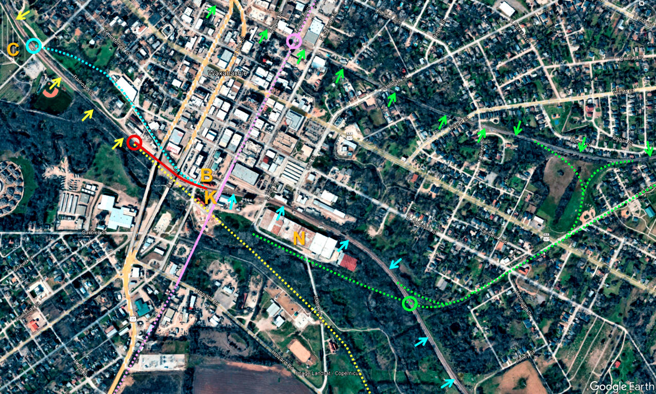 SP tracks passed in front of the tower. Grand Ave. (green arrows) crossed both rail lines and the connecting track (red arrows) at grade. The two crossbucks in Barriger's photo convey the illusion that the Grand Ave. grade crossing of the Katy tracks (pink circle) was closer to the tower than the Grand Ave. crossing of the SP tracks (yellow circle.) The aerial image shows otherwise. |