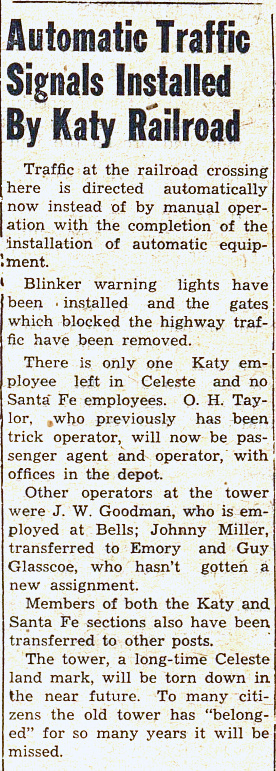stopped at Celeste. Below and Right: The Celeste Courier of January 20, 1961 lamented the recent razing of the railroad station and described the trains that still passed through Celeste. ![]() |