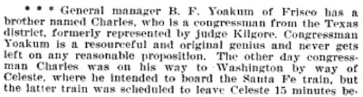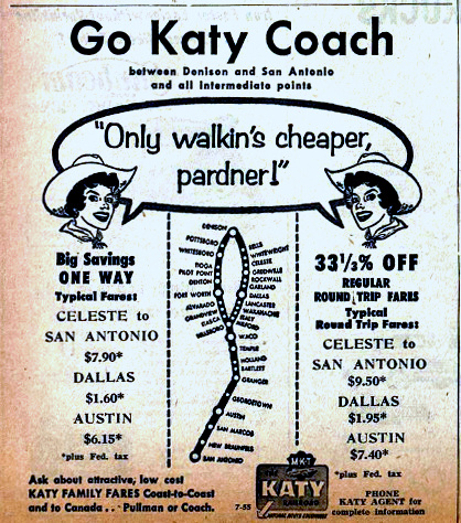While traffic through Paris was steady, it was nonetheless a "dead end" for the Santa Fe and thus dependent to some extent on Frisco traffic over the bridge. In contrast, the Katy route north through Denison led directly to Katy's extensive route structure in Oklahoma, Kansas and Missouri. Frisco and Santa Fe did collaborate on passenger service, operating the Texas Limited between Dallas and St. Louis via Paris which passed through Celeste. Beginning in 1915, Frisco and the Katy began jointly operating the Texas Special, a flagship passenger service for both railroads between San Antonio and St. Louis via the Red River bridge at Denison. The Texas Special to Dallas passed through Celeste (there was also Texas Special service to Ft. Worth that split off at Denison.) The Katy also had passenger trains through Celeste that did not involve the Frisco.