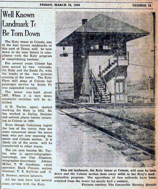 There was easily enough traffic over the diamond to justify a manned interlocking tower at Celeste, and there turned out to be sufficient traffic to sustain that need for nearly 50 years. On March 30, 1907, the Railroad Commission of Texas (RCT) authorized Tower 69 to begin operations at Celeste to manage the Katy / Santa Fe crossing. The tower housed a mechanical interlocking plant with 32 functions, a relatively high number, likely due to signals and switches controlled from the tower for station tracks, exchange tracks and sidings. The contract between the two railroads for the operation and maintenance of Tower 69 was dated July 22, 1907. For an "indefinite" duration, the railroads agreed to split all tower-related expenses evenly.