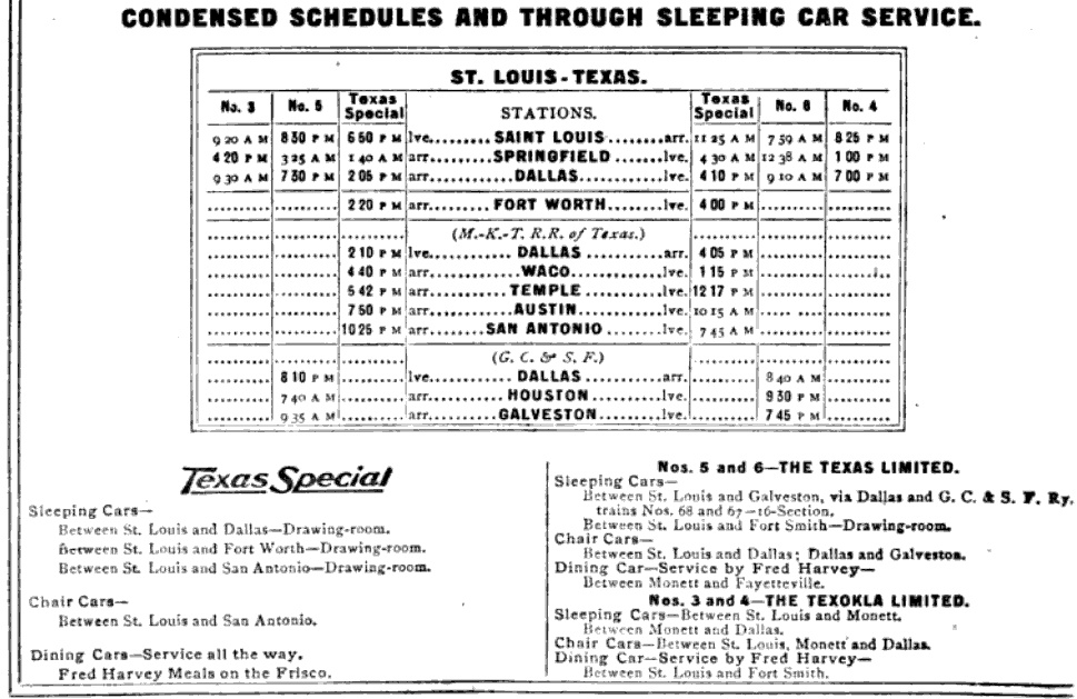 This ad for Frisco passenger service for the St. Louis - Texas market appeared in