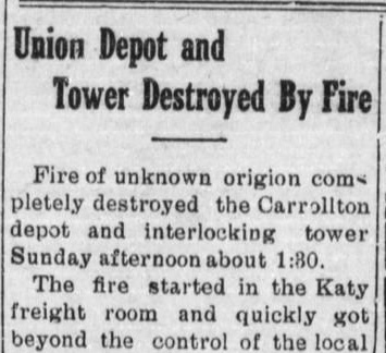 all three railroads at Carrollton. It was apparently a massive fire, its