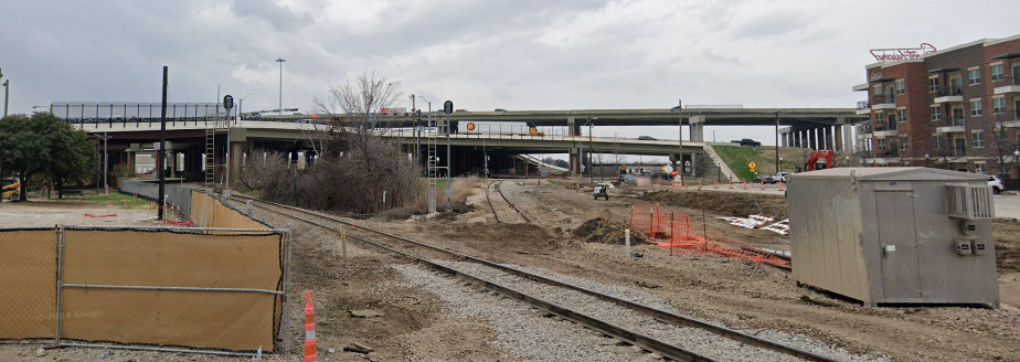 section of former Cotton Belt tracks beneath the overhead DART bridge. Farther